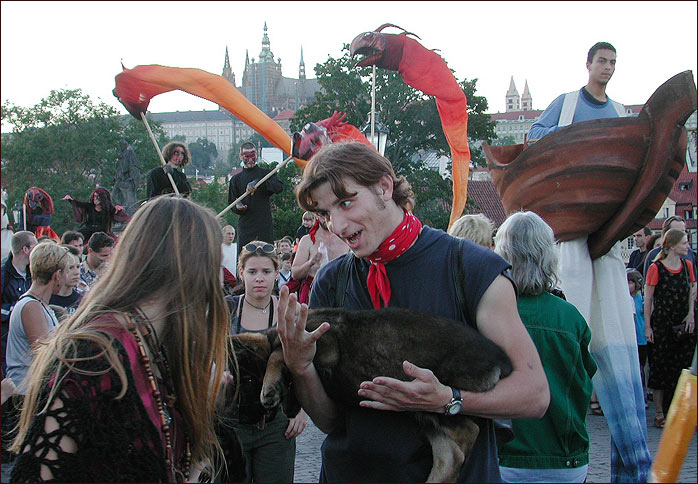 <b>Výmluvy:</b>, hlavní motiv je sice ta dvojice, ale nechat si ujít to prostředí z jak H.B. to by byla škoda, ne? Stovky lidí, ano stovky, na mostě, tlačenice. Ti nejvíc rušící lidé jsou fotografové, vpravo je noha stativu, Mario, to jsi přehlédl. Clona na digitálním CP990 byla téměř minimální. <br><p>Btw., Mario, máš zájem o moje komentáře? ;-)
