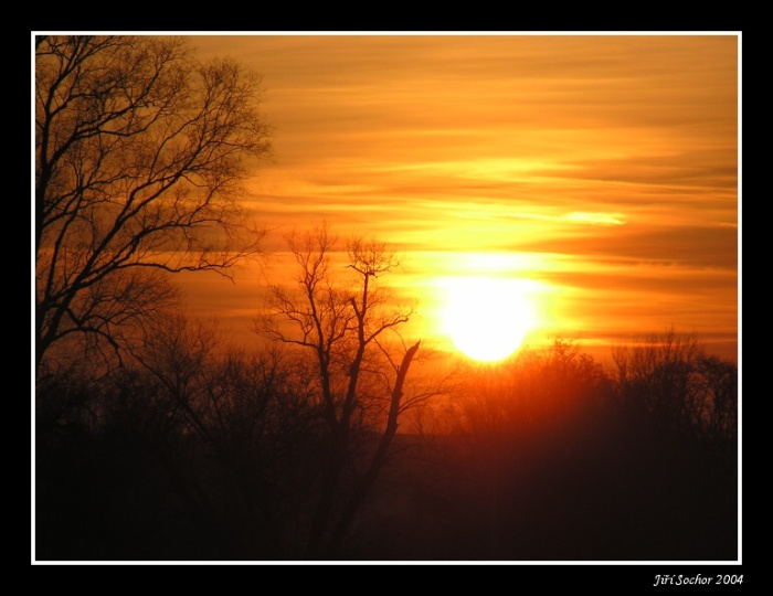 uvítací body nedávám. To jen tak na začátek. Fotka se mi nelíbí. Západ slunce stokrát jinak, když se tu porozhlídneš, uvidíš tu spoustu naprosto stejných fotek, které se liší snad jen v pár pixelech. Motiv západu slunce je tak nechutně otřepaný a tolikrát ofocený, že to už opravdu musí být extratřída, aby to za něco stálo. Tady není vůbec nic, jen neostré stromy, které z toho dělají chaos, velká rudá koule, co by z toho dělala alespoň kýčovku, kdyby tam přelétal nějaký čáp, či něco takového, nebo běžel kůň. Je to prázdné, bez nápadu, jen cvaklý západ slunce, práce nula. Možná barvičky, ale to fotku pořád nedělá. Omlouvám se za kritiku, určitě se jí nedej odradit, budu jen jeden z mála, ostatní se nad tím budou rozplývat.