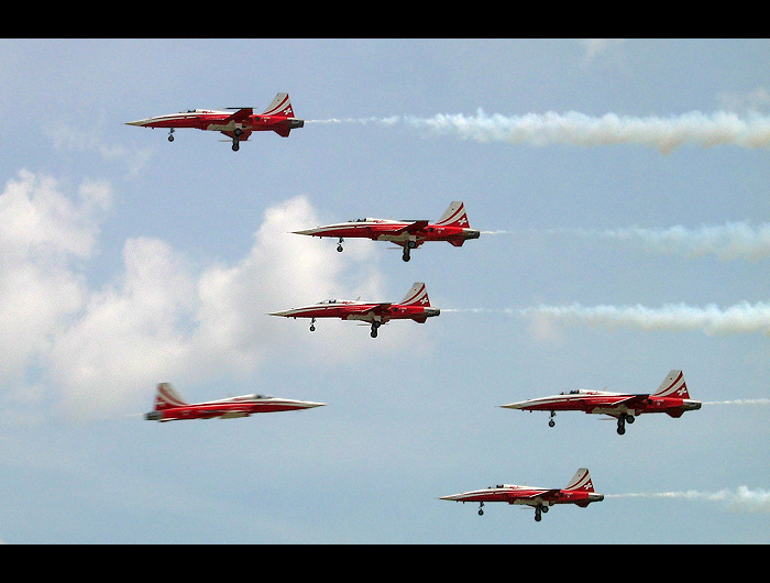 Hansi, hansi, ked sa blizsie pozries, tak tie v protismere letia na "minimalke" a maju vytiahnuty podvozok (to sa vzdy robi, keby to nahodou nevyslo a museli by nudzovo pristat a tiez to vyrazne spomaluje). No a solista leti na plne oo, cize ani kratka expozicia ho nezachranil pred rozmazanim. Tolko na temu fotomontaz :-)