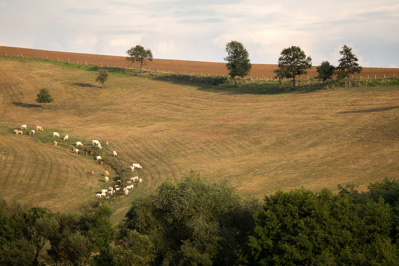 skúsil som ubrať spodku, ale chýbal mi základ; páčil sa mi výrez z krajiny, a tými kravkami akoby to dostalo konkrétnejšie kontúry; a zaujal ma ten jednotný farebný odtieň naprieč celou krajinou, taký vyprahnutý, až na tie stromy, ktoré odolali (fotené pred týždňom)