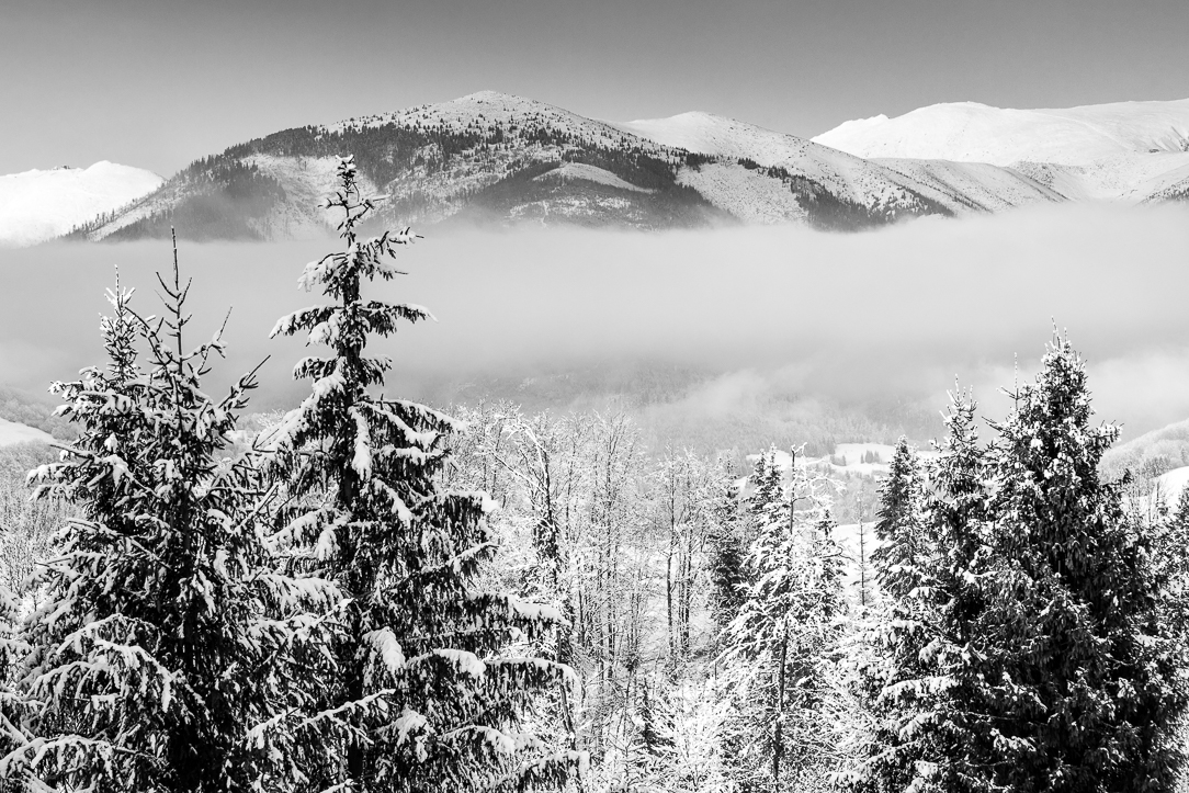 južná strana NT; vľavo Chopok, (na hrebeni vidieť stanicu lanovky) uprostred zalesnený Veľký Gápeľ, vpravo vzadu ten biely zúbkovany hrebeň je Krupova hoľa a hneď vpravo Ďumbier (hladký oblúk) a nizšie vpravo pod Ďumbierom cca 1cm od kraja foto vidieť Štefánikovu chatu ... pohľad z Krajčova, Diela, lúk nad Mýtom pod Ďumbierom